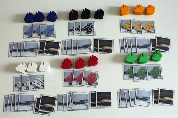 Mon jeu s’appelle donc Tempêtes et Galions, c’est un jeu que j’ai créé il y a quelques mois en quelques heures. C’est un petit jeu composé de cartes et de figurines de bateaux pour 2 à 6 jours dès 8 ans qui se joue en 10 minutes chrono, mixant mémoire et stratégie.