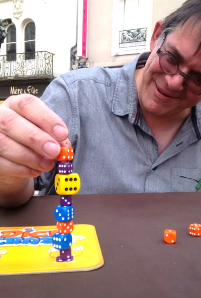 R : Dice Crash est sorti en septembre dernier, Twin’it vient de sortir et j’ai dans mes valises pour les amateurs de jeux un peu plus longs, un futur jeu bombyx. S’il y a des festivaliers qui veulent tester Consortium, pour peaufiner les réglages. C’est un jeu qui dure entre 45 mn et 1 heure … donc n’hésitez pas à me faire signe.