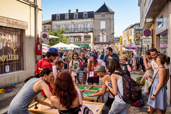 Animation rue en jeu sur le festival des jeux de Parthenay, entrée de la place des bancsY : Thierry, de mémoire tu as participé à toutes les éditions sauf une et toi Etienne ?