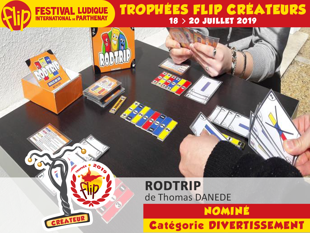 T : J’ai voulu créer un jeu, simple, modulable, rapide et surtout que les règles s’adaptent à tous. J’ai retenu 2 jeux extrêmement joués par les enfants (UNO et le jeu de Nim) ; du coup j’ai mixé la mécanique des deux jeux et rodtrip est sorti. J’ai commencé à le montrer au public en Octobre 2018 lors du salon du jeu Périjeu à Périgueux.