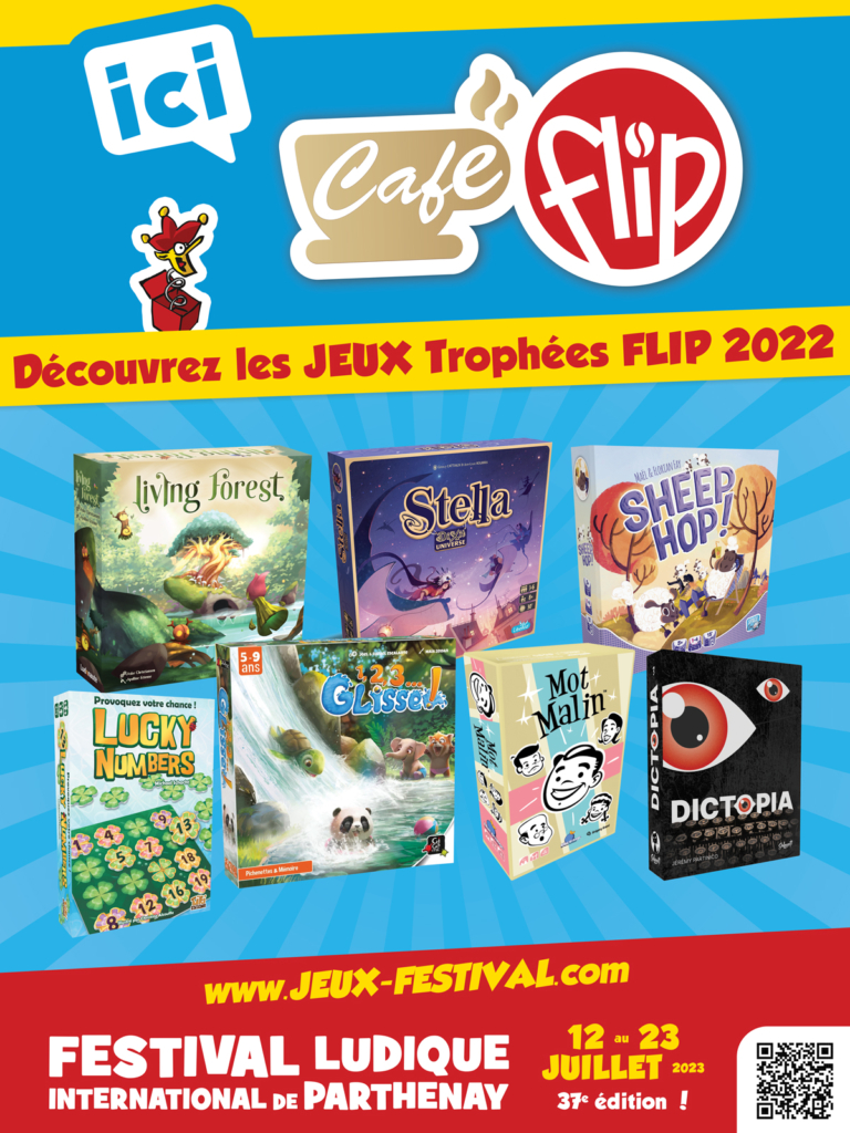 Retrouvez en animation les jeux primés sur le FLIP dans 16 Cafés FLIP dans toute la France ! Les quatre Trophées FLIP Éditeurs 2022 (123 Glisse!, Stella Dixit Universe, Living Forest, Dictopia), ainsi que les trois labels ÉducaFLIP 2022 (Mot MalinSheep HopLucky Numbers).